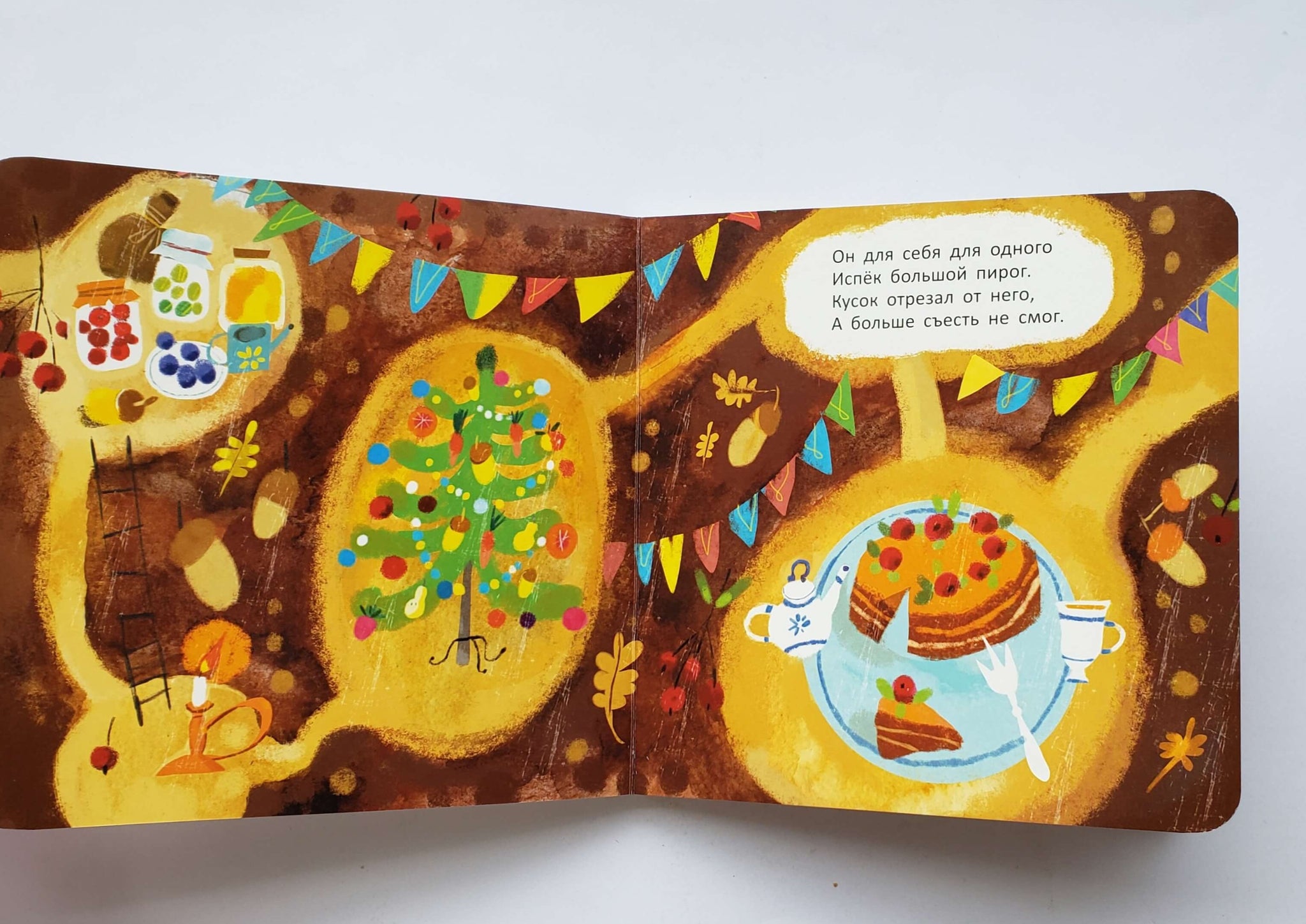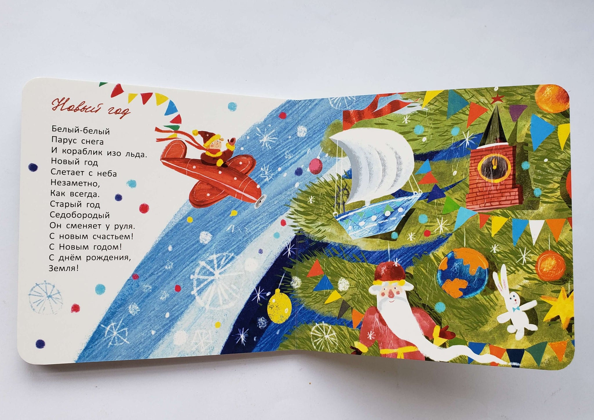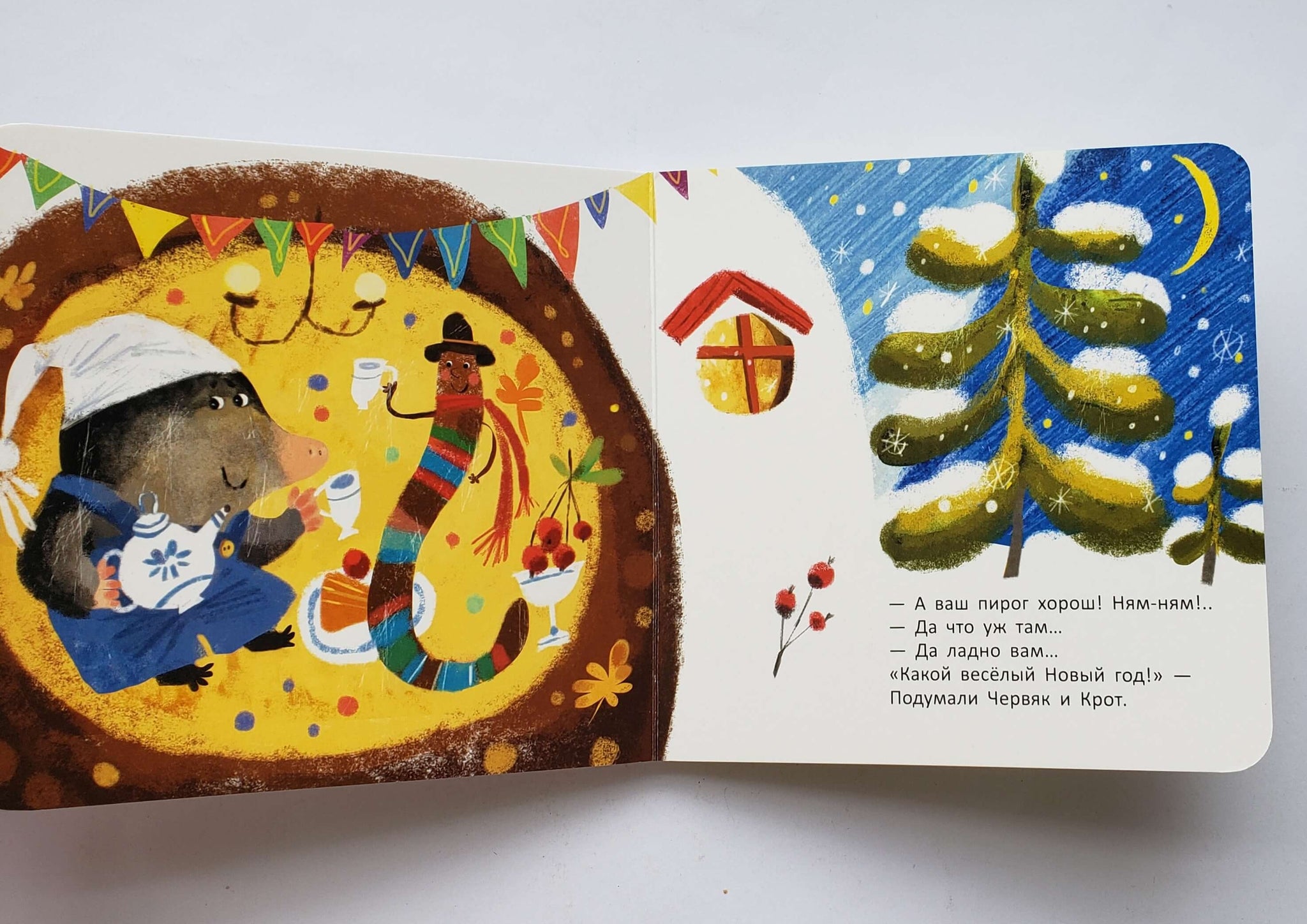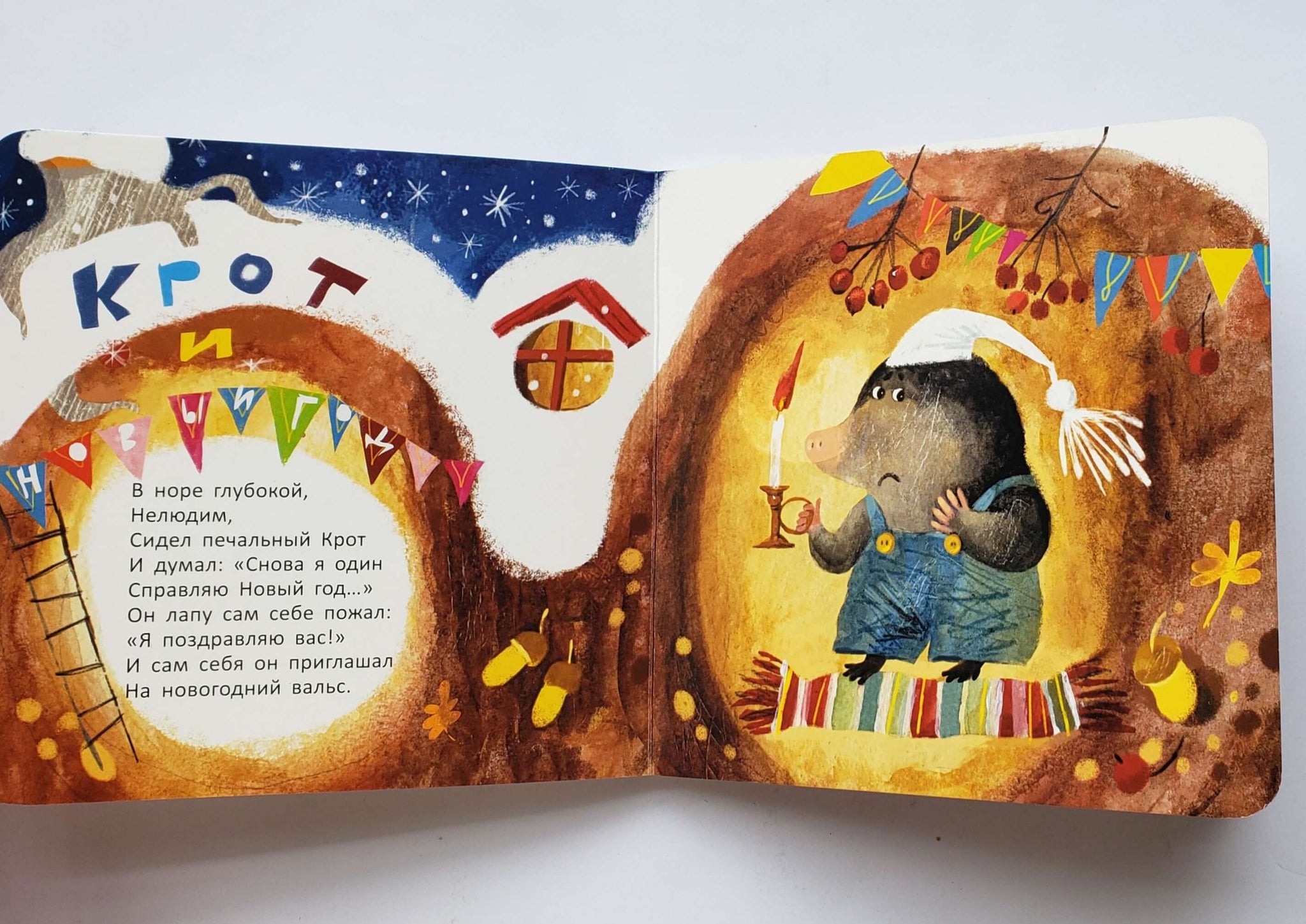 Как и все книжки серии, "Крот и Новый год" изготовлена из плотного картона со скруглёнными краями, так что её можно трогать, гладить и пробовать на зуб.
